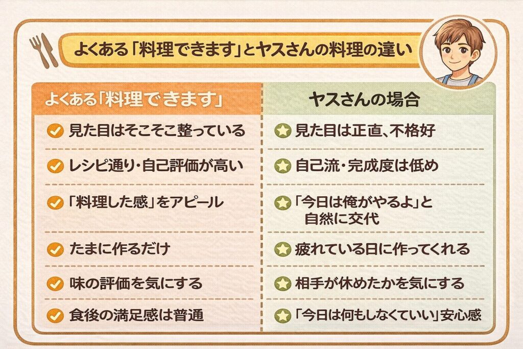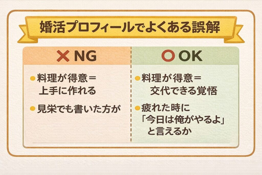 プロフィールに「料理できます」と書くなら、それは「プロ並みに作れる」という意味じゃなく、「あなたの疲れを半分背負う準備ができています」という意味で使いなさい。