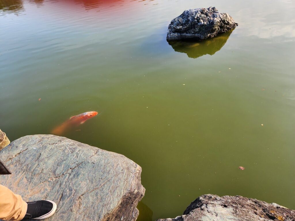 池のほとりをゆっくり一周すると池には、鯉や亀が生息していたわ。