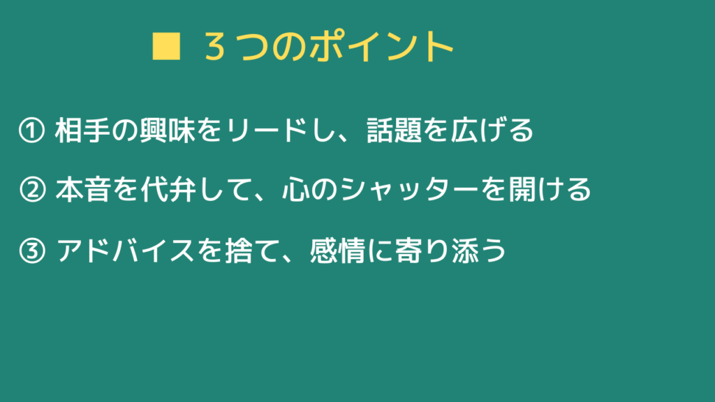 前回お伝えした「盛り上げようと頑張らない姿勢」も、すべて今日お話しした「深い共感」を相手に届けるための余裕を作るためなの。