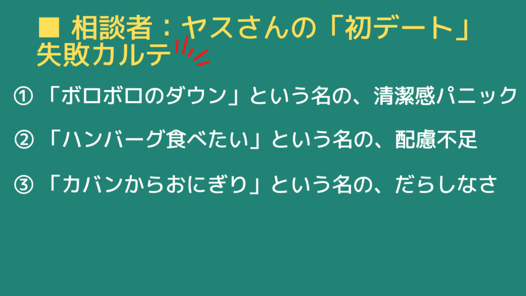 ■ 相談者:ヤスさんの「初デート」失敗カルテ