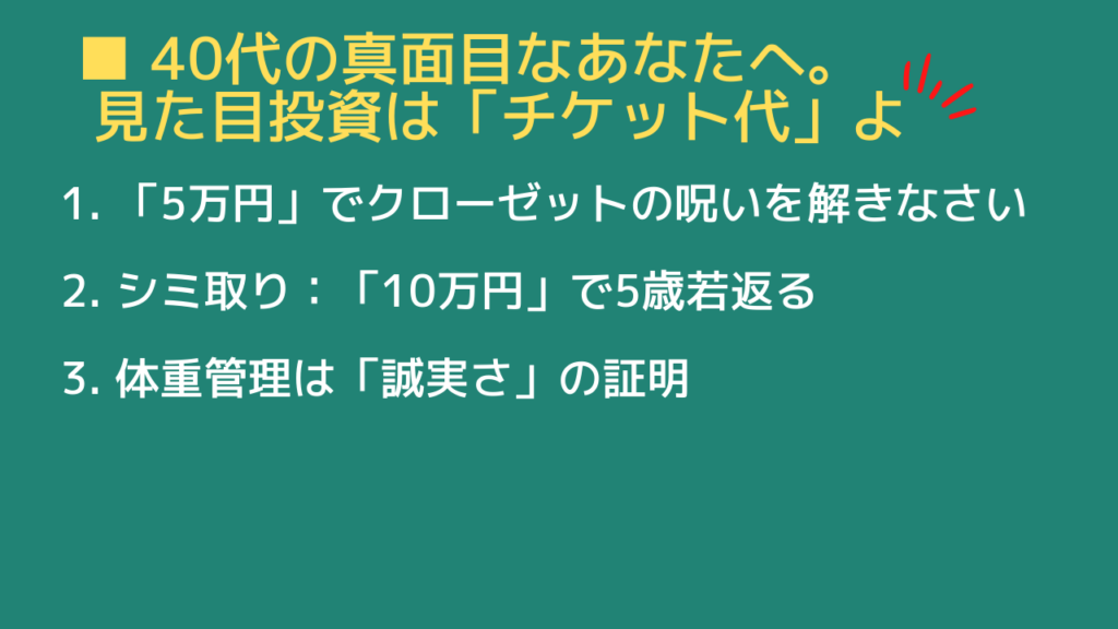 ■ 40代の真面目なあなたへ。 見た目投資は「チケット代」よ