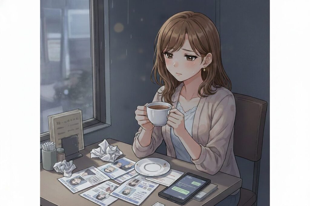 カフェの片隅で、スマートフォンの画面と睨めっこしながら溜息をつく女性。