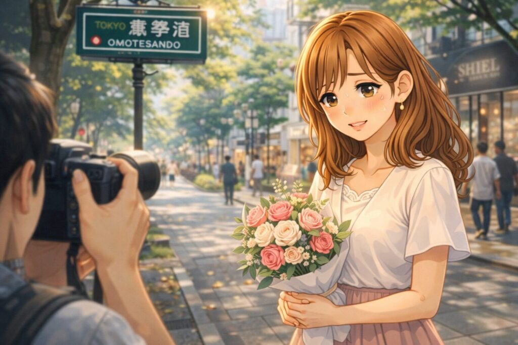 私はあえて、表参道の街角での外ロケ撮影を選んだの。